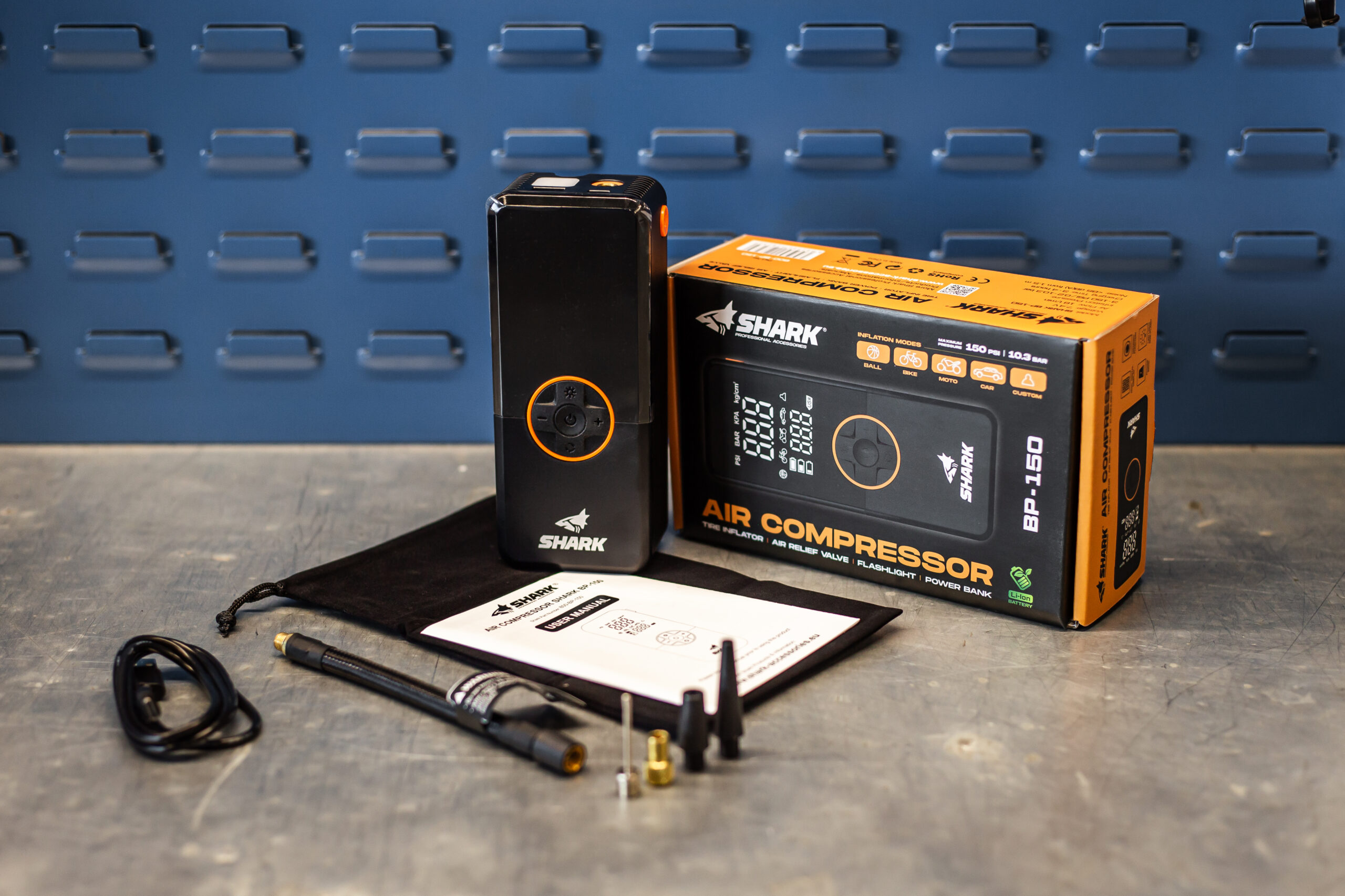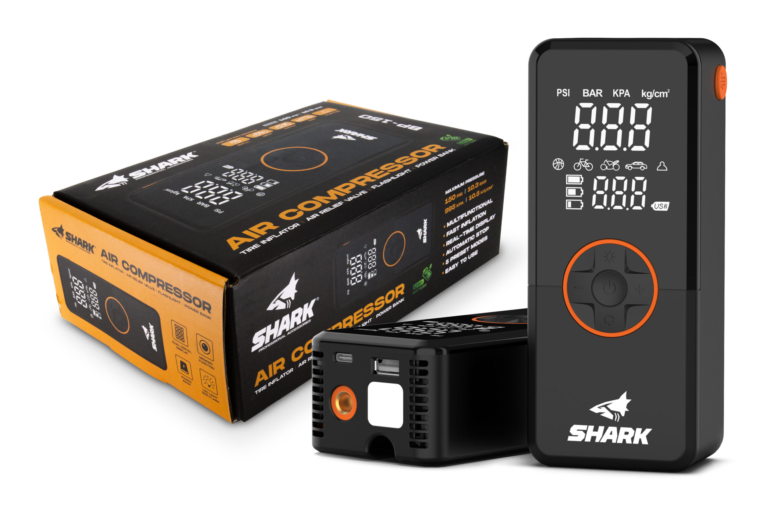 Den kompakte og oppladbare SHARK BP-150 er en alt-i-ett-løsning for rask og presis pumping av dekk. Den passer perfekt til biler, motorsykler, sykler, ATV-er og baller, og fungerer også som nødstrømbank (2000 mAh) og kraftig LED-lykt.